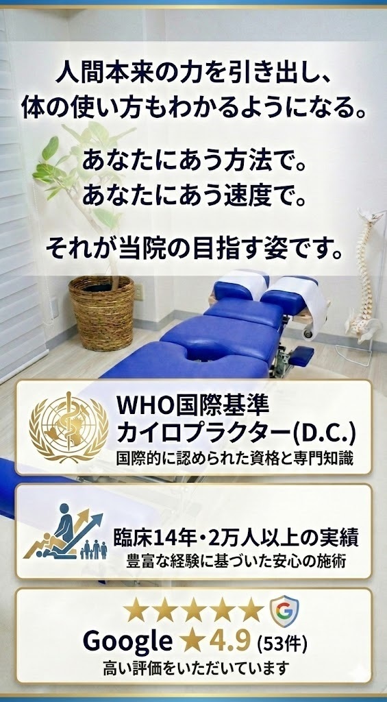 当院では国際基準の技術と2万人の臨床経験から、あなたの体に染みついた「無意識の力み」と「動き方の癖」を読み解くことができます。そして「体の使い方のコツ」を一緒に身につけていきます。(つらい筋トレはありません。)