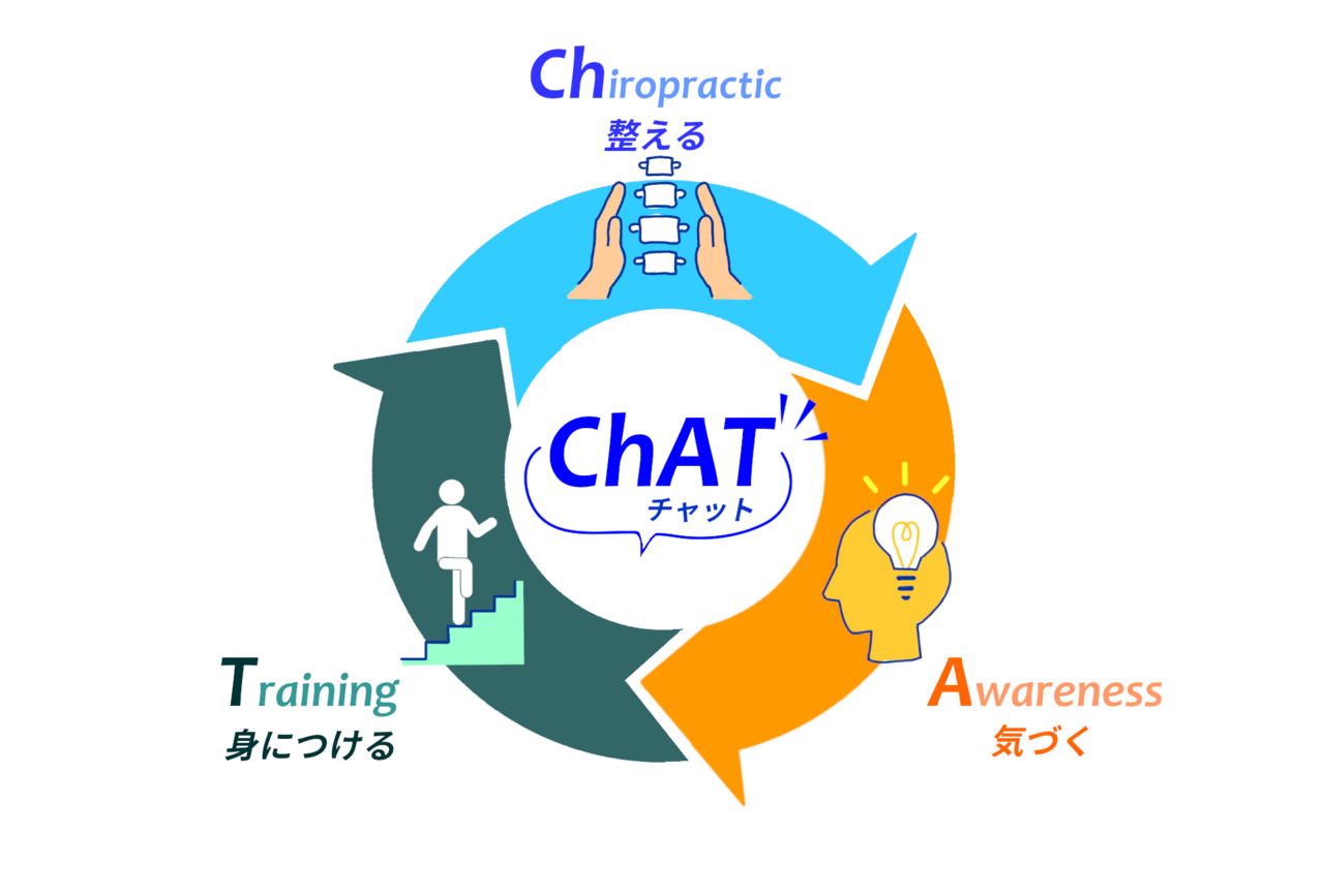施術(Chiropractic)で体を整え、本来の感覚に気づき(Awareness)、正しい動きを身につける(Training)。この3ステップを繰り返す「ChATサイクル」により、一時的な緩和ではなく、体が正しい動きを学習し、定着させていきます。