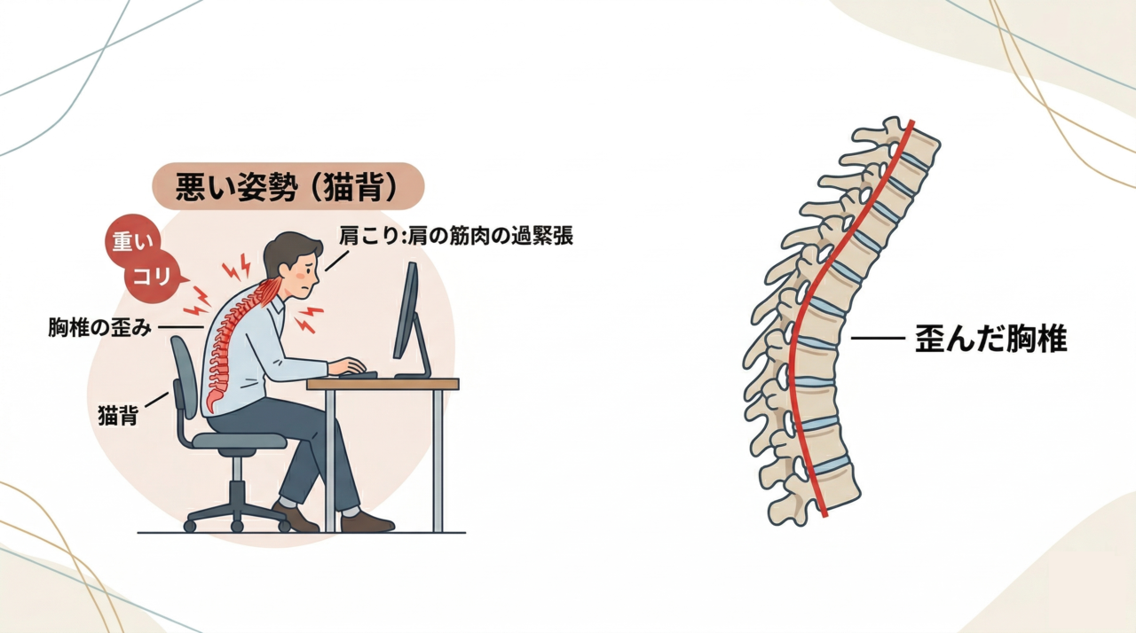 注目するのは、胸椎(背骨の胸の部分)の動きの偏りと、神経系への影響です。デスクワークや長時間のスマートフォン使用によって、胸椎の特定の関節が動かなくなると、脳からの指令が正確に伝わりにくくなります。すると体は無意識に「力み」で姿勢を補おうとし、肩まわりの筋肉が慢性的に緊張した状態に。