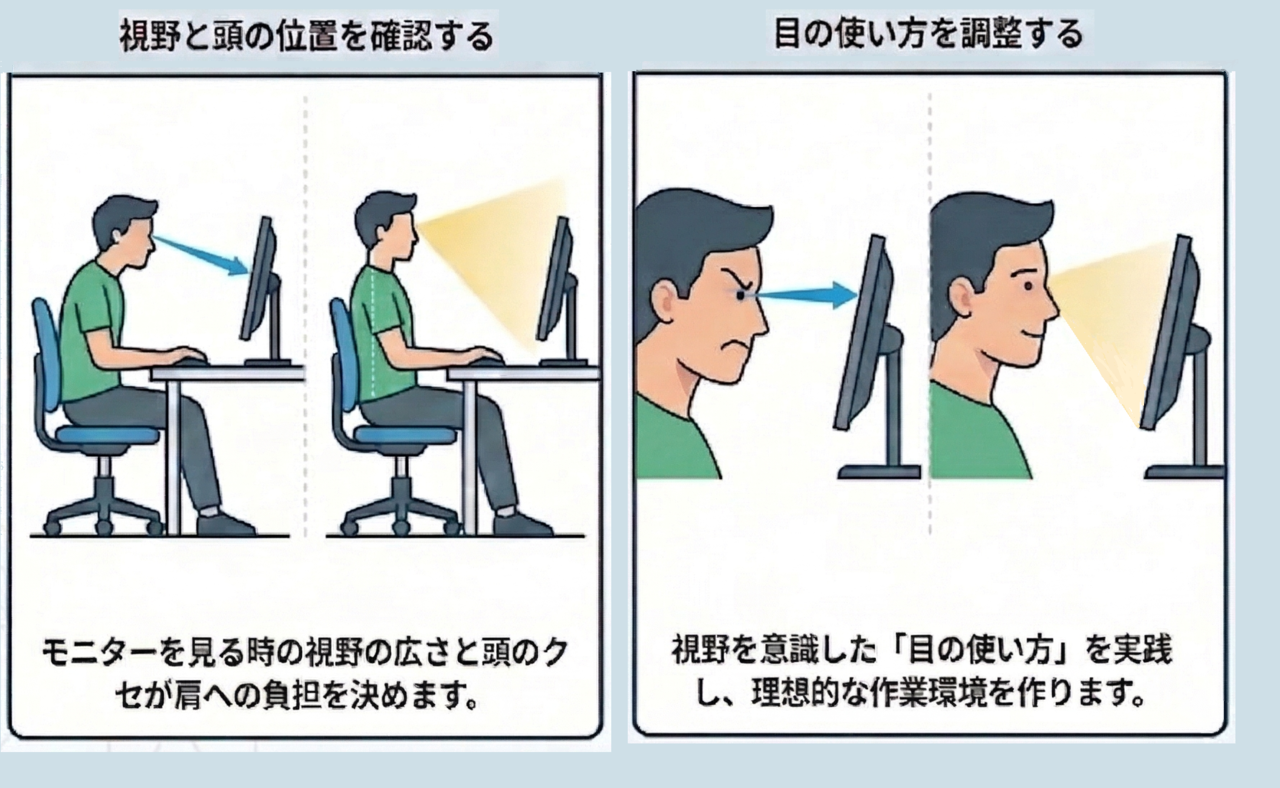 さらに見逃されやすいのが、目の使い方と首の関係です。モニターを見るときの視野の広さ・頭の位置のクセが、肩への負担を大きく左右しています。「デスクワークだから仕方ない」ではなく、座り方と目の使い方を変えるだけで、肩への負担は大きく変えられます。