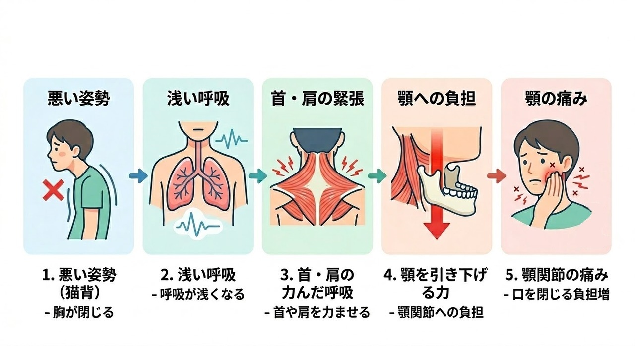 さらに見逃されやすいのが呼吸と姿勢の影響です。猫背・前傾姿勢で胸が閉じると、呼吸が浅くなり、首や肩を力ませた呼吸の習慣が生まれやすくなります。そうした呼吸の仕方は顎を引き下げる力が生じてしまうので、口を閉じるための顎関節への負担を増やしてしまいます。「顎が痛い」の原因は、顎の外側にあることが多いのです。