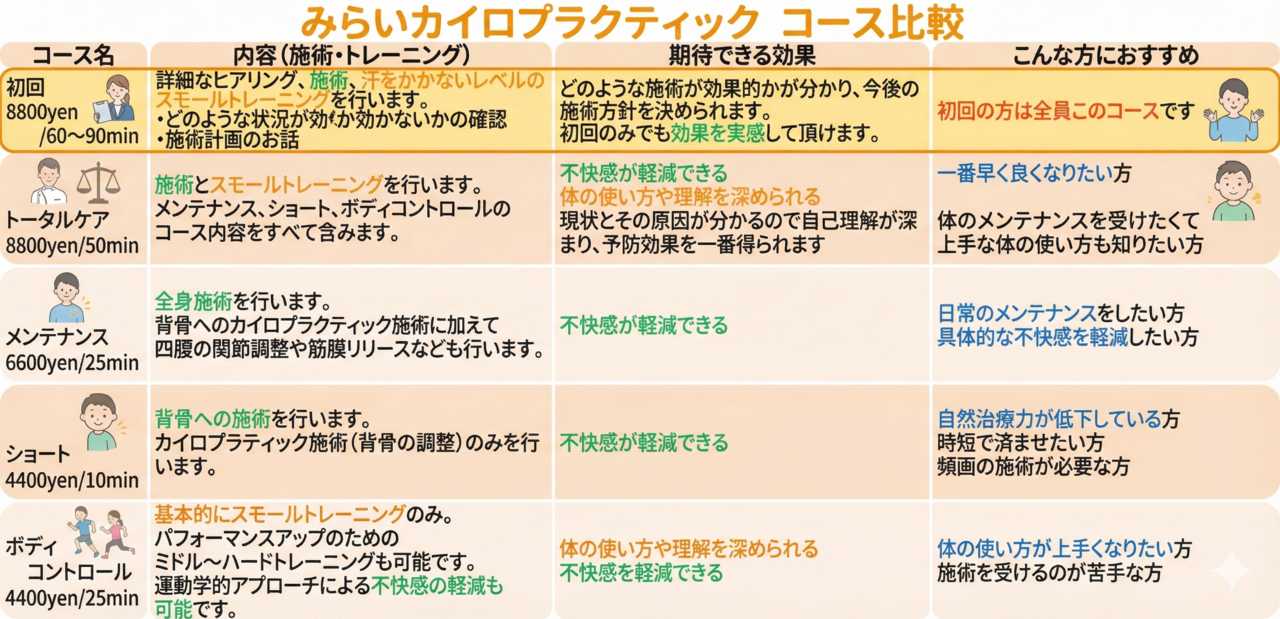 | 初回コース(60分) (お体の分析・説明・施術) 「なんとかしたい」 不調や違和感の正体が分かる 整体体験60分 当院独自の1.5回目システムについて | 8,800円(8,000円) |